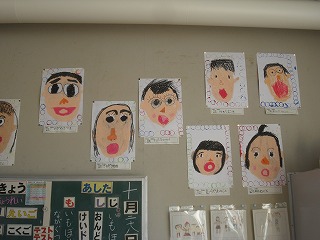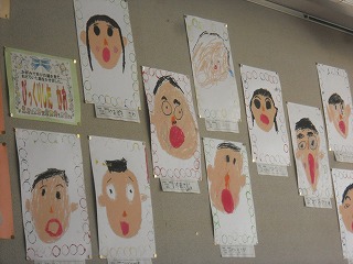 先日1年生が図工で描いていた、「びっくりした顔」が完成し、教室に掲示してあります。色がつくとまた表情が豊かに見えますね。