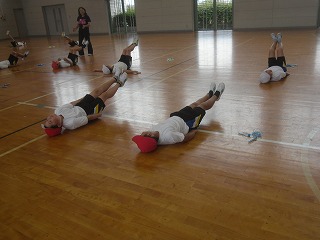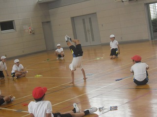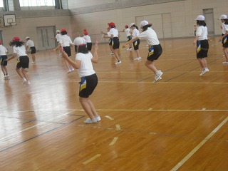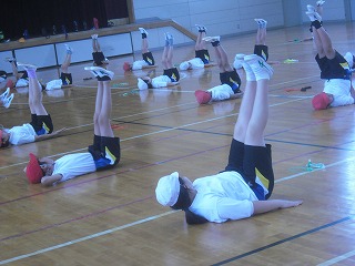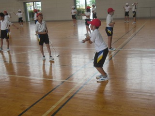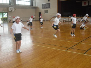 5年生は、体育の初めのウォームアップのところで、体感トレーニングや縄跳びをしていますが、連続二重跳びやハヤブサ跳び、交差二重跳び、後ろ二重跳びなど、様々な種目で競い合っています。