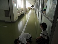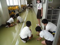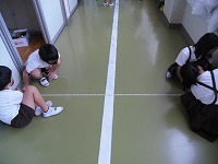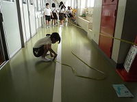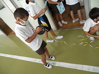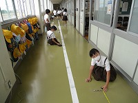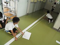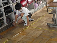 子どもたちは、巻き尺で、廊下の幅や長さ、教室の端から端までの長さなどを協力して測っていました。
