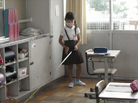 3年生が、長いものの長さを測っていました。昨年までは、30cmものさしや、1mのものさしを使っていましたが、児童一人が両手を広げた長さが1メートル数十センチまで成長している現在はそれだけでは足りません。