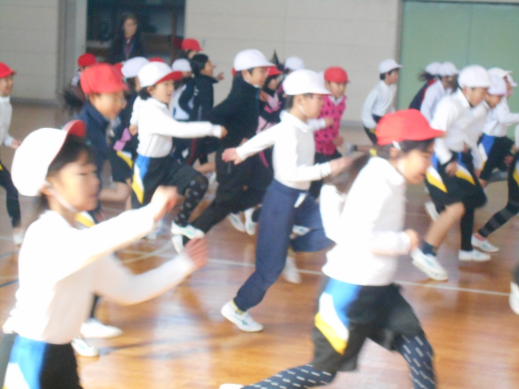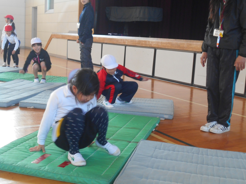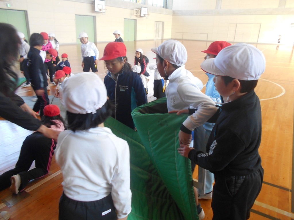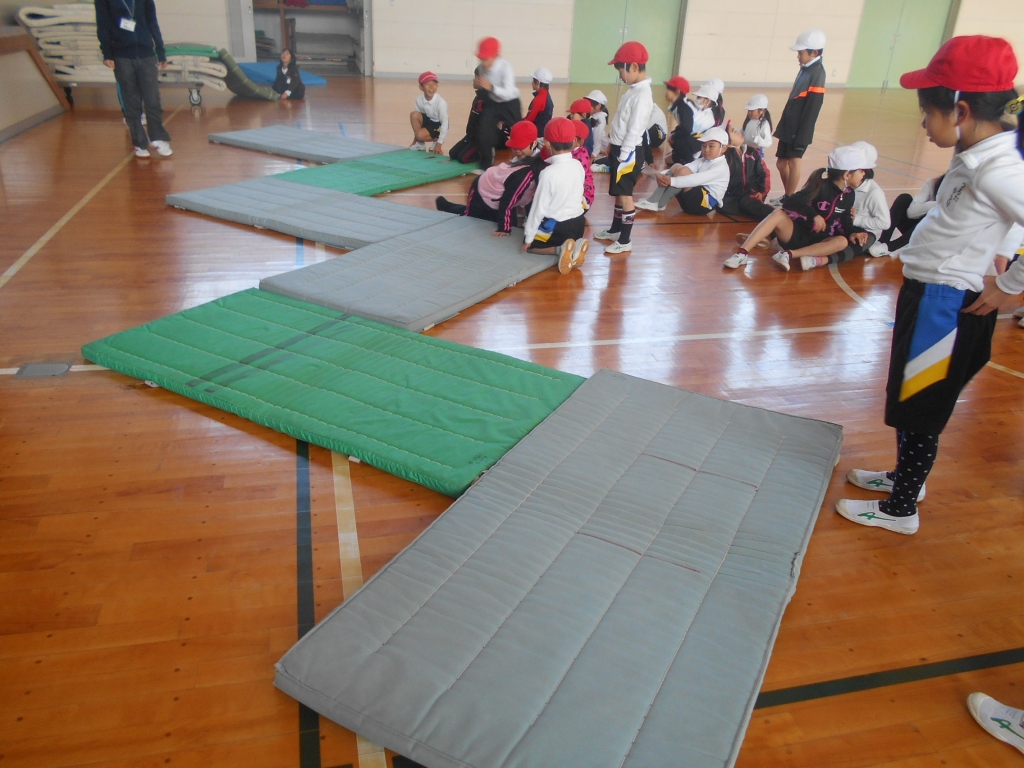 2年生は、体育でマット運動をしました。自分たちでマットをジグザグに並べ、前転や後転をしながら進みます。壁までスキップをし、壁にタッチして、早く並んだ子から順番に行います。楽しく運動しています。
