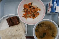 サボテン入り肉あんかけうどん(白玉うどん) 牛乳 人参の塩昆布和え 栗と薩摩芋(さつまいも)のココアケーキ