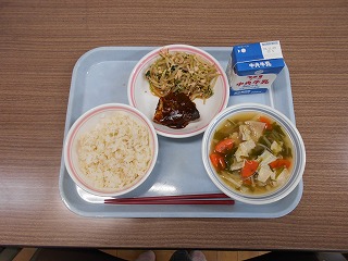 金芽ロウカット玄米ご飯 牛乳 サバの八丁味噌煮 三つ葉とササミのごま酢和え 湯葉とめかぶのすまし汁