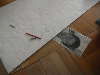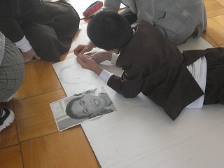 4年生が取り組んでいる等身大に自分づくりで、自分の顔や体を描いています。日ごろ使うノートや画用紙とは桁が違う大きさなので苦労しながらも、自分の顔写真を拡大したものを見ながら、表情豊かに描いていました。