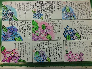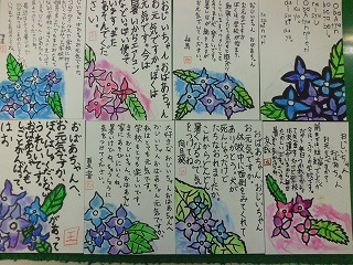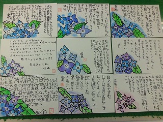 5年生が、暑中見舞いのはがきで絵手紙を書きました。以前パンジーの絵を描いていましたが、今回は紫陽花(あじさい)です。