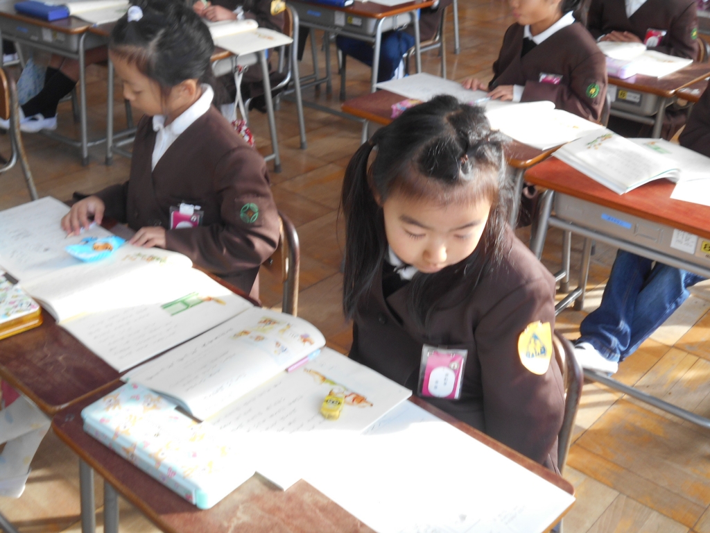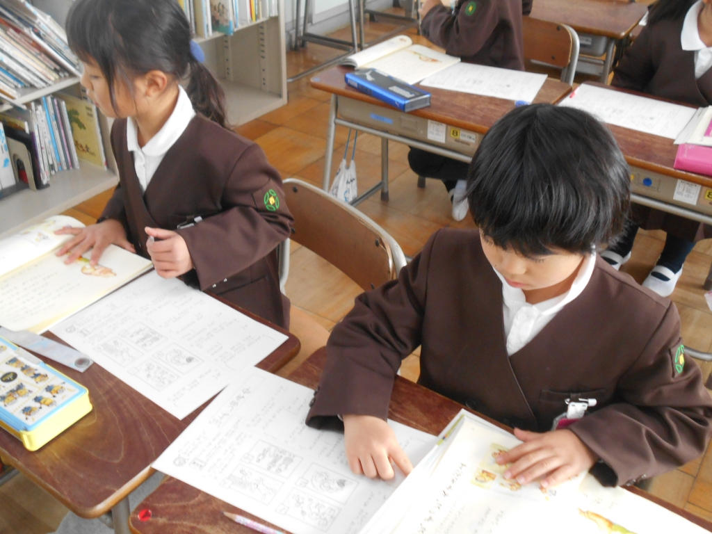 1年生は、「ずうっと、ずっと、大すきだよ」のお話を読んでいます。今日は、ワークシートを使って学習しました。