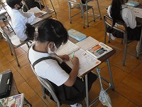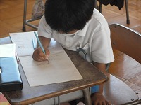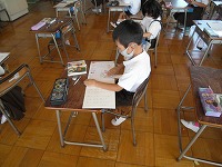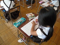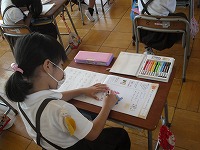 1年生が国語で、北原白秋の「赤いとりことり」を書き写していました。また、イメージを広げるために、赤い鳥の絵に色を塗っていました。