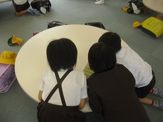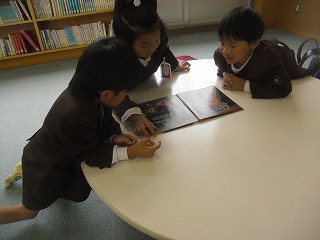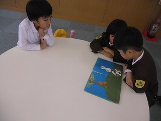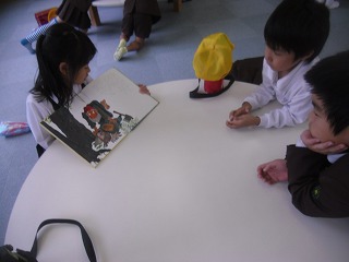 1年生が図書室で読み聞かせリレーをしていました。グループごとに好きな絵本を選び、2ページずつ交代しながら自分の班のみんなに読み聞かせをします。