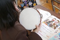 1年生がリズム楽器を使って、歌に合わせながら合奏しました。歌の途中で一緒にたたくリズムは決まっていますが、歌の最後に鳴らす音は自分で独自に考えて表現します、お互いに聞きあいながら楽しく合奏しました。