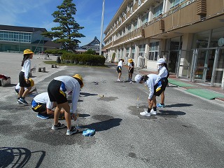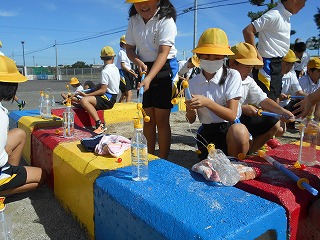 4年生が理科の「空気と水」の授業で、閉じ込めた空気の性質を調べるために、ペットボトルと注射器で噴水の実験を行いました。