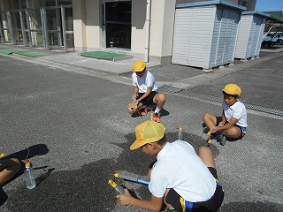 何度も実験をして噴水の水が自分にかかり、ぬれてしまう子もいました。