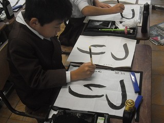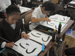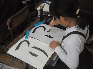3年生が書写で「つり」という字を書いていました。この字は直線の部分がなく、すべて曲線でできています。筆を動かしながら常に進行方向を考えて書かなければなりません。うまくできたでしょうか。