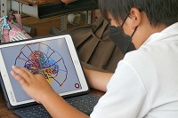 3年生がタブレットで使えるソフトを使って芸術作品を作っていました。画面で指を動かすと、その動きに連動して色や動きが万華鏡のようにデザインされます。万華鏡を見たことがある人はイメージができると思いますが、自分では想像できないような画面になっていく感覚が不思議です。