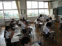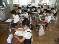 2年生が国語の言葉遊びで「あいうえお作文」に挑戦していました。文節の始まりを「あ、い、う、え、お」で始まるようにする「あいうえお作文」は、いろいろな言葉を組み合わせる面白さがあります。子どもたちは、「うで始まる言葉がないよ~」など、悩みながら、工夫して文を作っていました。
