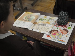 5年生が家庭科の調理実習へ向けて、調理の仕方の予習をしていました。栄養素の特徴を考えながら野菜をゆでる時に気を付けることなどを学習します。