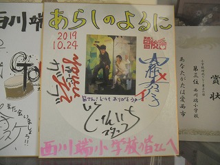 今年の芸術鑑賞会で「あらしのよるに」を演じてくれた、演劇人「冒険舎」の3人の記念色紙が玄関内の展示ケースに飾ってあります。機会がありましたらご覧ください。