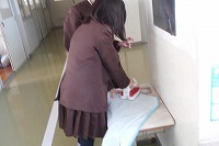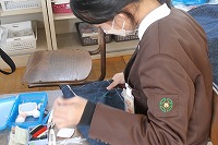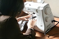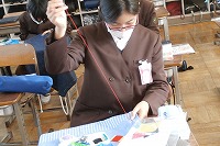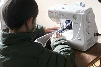 5年生が家庭科でエプロンを作っています。大きな布を型紙に合わせて裁ちばさみで切り、アイロンで折り目をつけて、針と糸で塗ったりミシンをかけたりします。