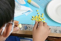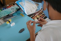1年生が図工の「ごちそうパーティー」を作り始めました。白い紙粘土に少しずつ絵の具で色をつけて、好みの色の粘土を作り、だんだん形を作っていきます。絵の具がどうしても手につくので、顔をさわったりした時に手の色が顔についてしまう子もいました。