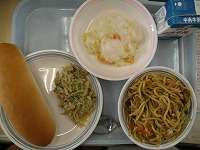 小型ロールパン 牛乳 焼きそば 豆苗とささみの胡麻酢和え フルーツババロア