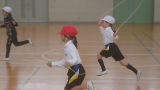 完走大会が終わりましたので、昨日の1年生の体育は5分間走ではなく、体のつかいかたが中心でした。移動しながらのかけあし跳びと、その場でのかけあし跳びを、縄を一回回す間に2歩走るものや1歩のものなど様々なリズムで飛びました。