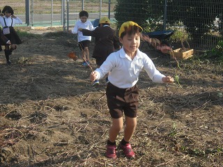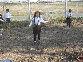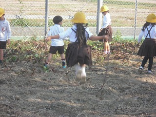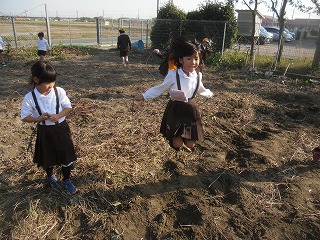 1年生が、収穫を終えた後のさつまいものつるでなわとびをして遊びました。子どもたちは昔から、身近な自然にあるさまざまなものを使って遊んできました。これからも、いろいろな工夫をして楽しく遊べるといいですね。