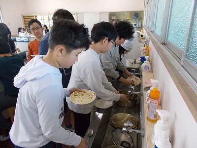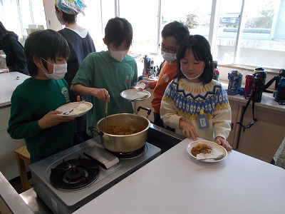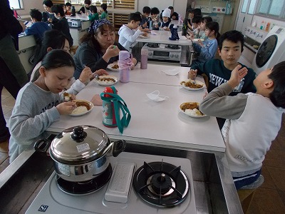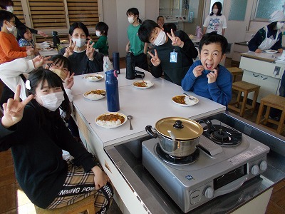 なお、ご飯は時間の都合であらかじめ炊飯器で炊いておきました。出来上がったカレーライスはどの班も大好評で、「うまい!」「おかわりしたい!」といった声も聞かれ、みんなでおいしくいただき、きれいに完食しました。