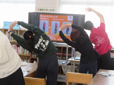 まずは、リカラボ接骨院の先生から、「子どもの生活習慣と姿勢」と題して、姿勢について、ご講演いただきました。講演では、①授業中の姿勢学校保健委員会の前に子どもたちが授業を受けている様子を接骨院の先生に見ていただきました)②姿勢の大切さ③ストレッチ指導を行っていただきました。