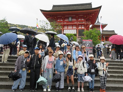 2日目は、班ごとに京都市内分散活動を行いました。専門のガイドさんとともに、市バスに乗ったり地下鉄を使ったりしながら2~3か所の目的地をめぐりました。雨でしたが、子どもたちには充実感があったように思います。次に清水寺の見学、清水坂でのお土産購入をしました。