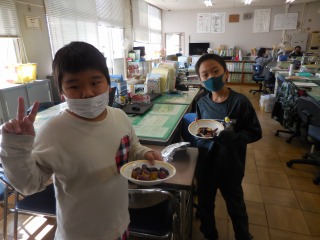 「あつあつのおいもだよ♪」と歌いながら職員室に登場したのは、あさがお学級の6年生です。自分たちが育てたお芋をふかして、職員室に持ってきてくれました。