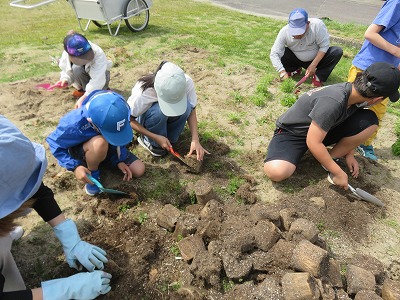 花壇整備をしています。すでに枯れてしまった花の土を鉢から出し、土をほぐしています。本校の花はほとんどが種から発芽したものです。