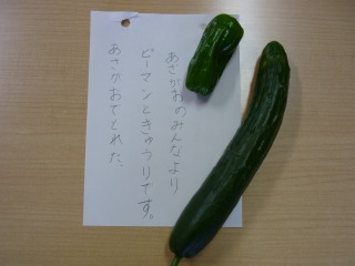 校長室にわざわざ届けてくれたのに、電話対応中でごめんなさい。職員室の机にかわいい置手紙とキュウリ・ピーマンが置いてありました。