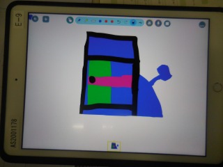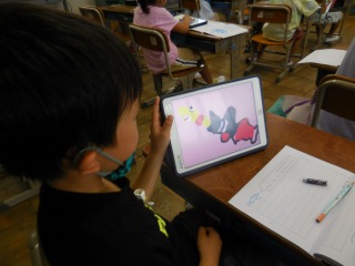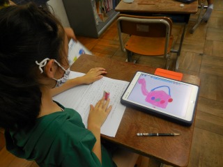 3松のリコーダー演奏の帰りに、2松教室に立ち寄ってみると、iPadで国語の勉強をしています。「あったらいいな こんなもの」の学習で、実際にiPadを活用し、絵を描き、ことばの広場に絵の説明を文章にして書き込んでいるところでした。