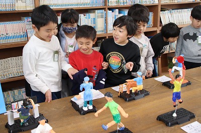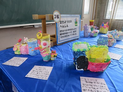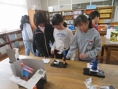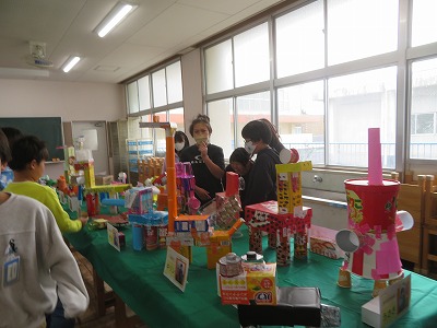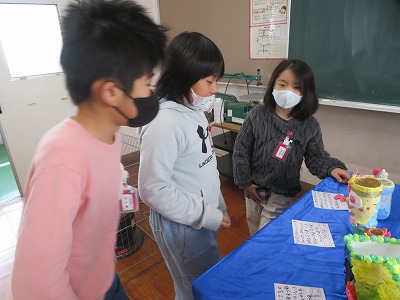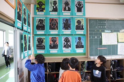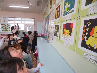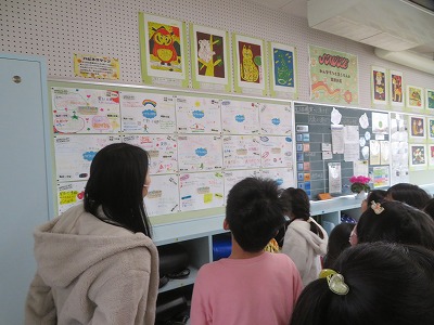 それぞれのクラスに掲示してある作品や階段や廊下にある作品、図工室や資料センターにある図工の立体作品などを見ました。どの作品も力作揃いで、