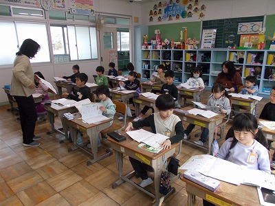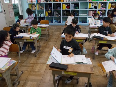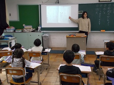 1年生の書写の授業で、書写の練習ノートに書いた自分の名前の成長ぶりを確認していました。4月、10月、2月に書いた名前を見比べて、お互いに上手になったところを話し合っていました。また、先生がタブレット端末で撮影して、順番にスクリーンに映し出し、皆で上手になったところをほめていました。2月に書いた名前は、どの子も明らかに4月よりうまくなっており、どの子も嬉しそうでした。