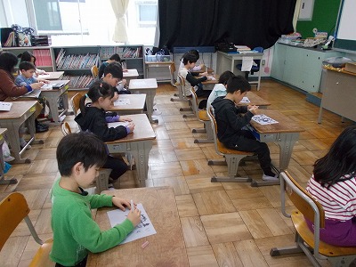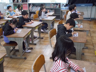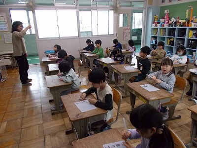 その後、水ふでを使って、名前や小学校名を書くことに挑戦しました。鉛筆とは勝手が違い、すぐにうまく書けない子が多かったようですが、少しでも上手に書こうと頑張っている姿が、とても素晴らしかったです。