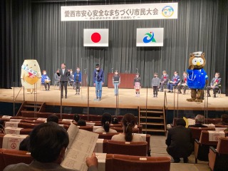 11月27日(土)14時より愛西市文化会館にて安心安全なまちづくり市民大会が開催されました。今年度は、立田地区2小学校の12名が選抜され、大会にて標語の朗読と標語に込めた思いを一言発表しました。