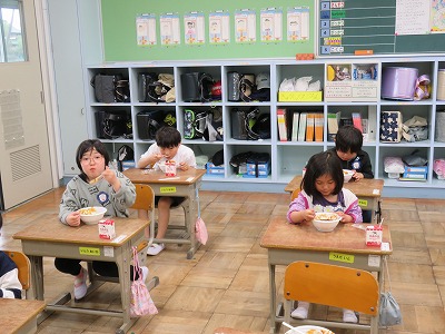 15日は、1年生にとって初めての給食でした。メニューは事情によりイレギュラーなものとなりましたが、「おいしい」と言って、うれしそうにいただいていました。