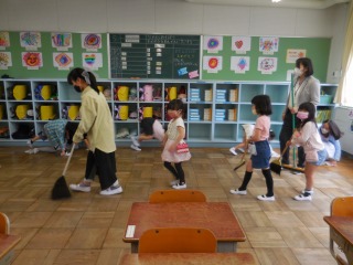 1年生教室では、6年生や担任の先生の後をカルガモの親子のように、掃除を進めている様子が見られました。きれいな教室は、空気もきれいですっきりですね。