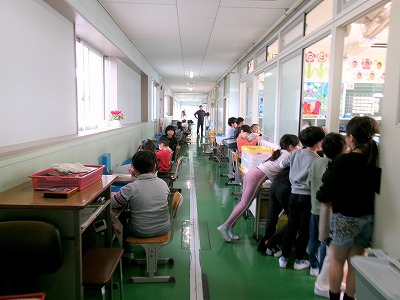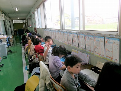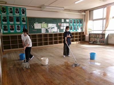 低学年は、廊下に机を出して教室掃除をしてから、各自の勉強を行っています。その間に担任の先生や6年生が手伝って教室のワックスがけを行いました。