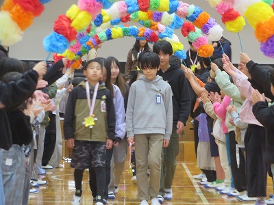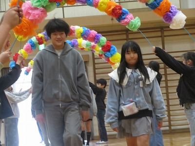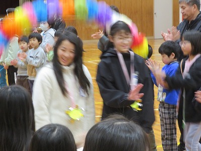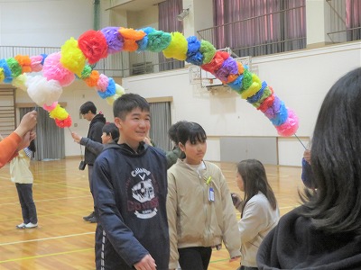 まずは、花飾りのアーチで6年生を出迎えます。各学年の出し物、6年生からの出し物がありました。1年生から5年生の皆さんは、これまで学校を引っ張ってくれた6年生に感謝する気持ちで、いろいろな出し物を行いました。心温まる会となりました。