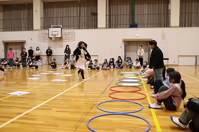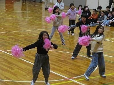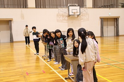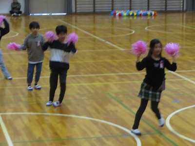 まずは、1年生から3年生です。後ろ跳びを誰が連続して跳び続けることができるか、という対決でした。4年生から6年生の皆さんは、場所を移動して応援していました。