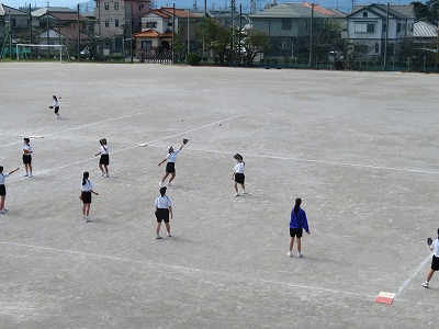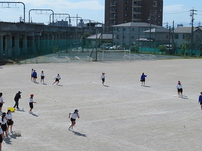 外を見てみると、3年生の女子が体育の授業で「ソフトボール」に取り組んでいました。授業ではしばらく前からソフトボールに取り組んでいるようですが、日に日に不慣れだった子たちが上手になり、お互いにアドバイスし合う様子もどんどん見られるようになってきて、たまに見る者からも成長を感じるほどになっています。