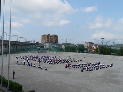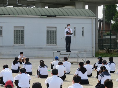 今日は火曜日ですが、今年度初めて全校生徒が集まって、臨時朝礼を行いました。本来であれば朝礼は月曜の朝に行いますが、昨日は学級写真撮影があったため火曜に変更をしました。感染症対策として運動場で行い、お互いの間隔を前後2メートルずつ空けて列を作り、マスク着用、さらに熱中症対策として帽子の着用も呼びかけて、健康・安全面に配慮をた上で、どうしても校長先生から直接生徒に伝えたいことがあったために実施をしました。