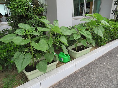 1年生の教室前では世話の甲斐あって、ひまわりがグングンと大きくなって、この夏にしっかり花を咲かせる準備が整いつつあります。