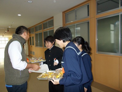 廊下を歩いてると、「作ったの食べてください!」と目を輝かせながら声をかけてくれる子たちがいました。さおり学級の子たちが、今日の1時間目に調理室でスイートポテトを調理し、それを先生方に配りに来てくれました。