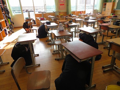 昨日の掃除の時間に、突然このような校内放送が流れました。子どもたちにも先生方にも告知をしないで、緊急対応をなるべく現実に近い状態で行う「避難訓練」です。