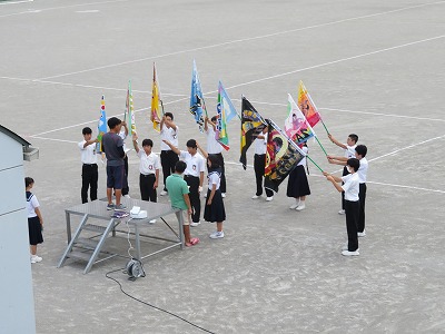 夏休み中にセレモニー実行委員の子たちが制作してくれたテーマパネルが校舎の上から見守る中、放課後の運動場ではブロック長や旗手の子たちなどが体育祭の開会セレモニーの段取りを確認してくれていました。