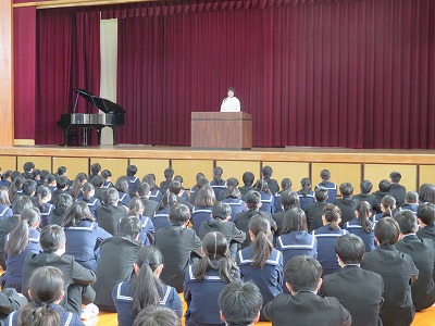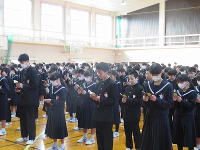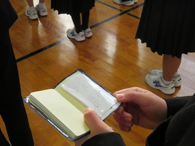 今日の朝礼は、本校で取り組んでいる「オレンジリボン活動」の「いじめないよ週間(7~14日)」に当てはまるため、先日の人権集会で生徒会から呼びかけがあった通り「オレンジリボンの歌」を歌いました。まだまだ歌詞が浸透していないだろうということで、子どもたちの生徒手帳に入る大きさの歌詞カードを用意して全校生徒で歌いました。こういう日々の活動の積み重ねの中で、人を思いやる気持ちや個性を大切にする感覚がどんどん子どもたちの心に染み込んでくれたらと思います。