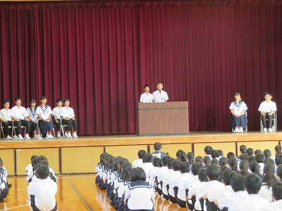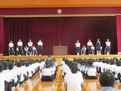 今日の6時間目には、体育館に全校生徒が集まり後期生徒会役員を選出するための「立会演説会」が行われました。