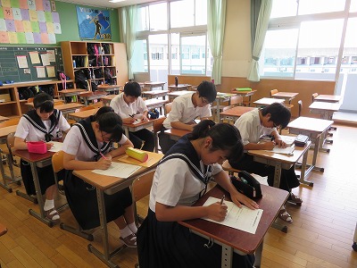 爽快な気持ちで給食を食べた子どもたちは、下校前に前期最後の委員会の時間となりました。と言っても、今日の委員会は、いつものように校内をあちこち動いて常時活動などに取り組むのではなく、どの委員会も写真のように着席して何かを書いています。